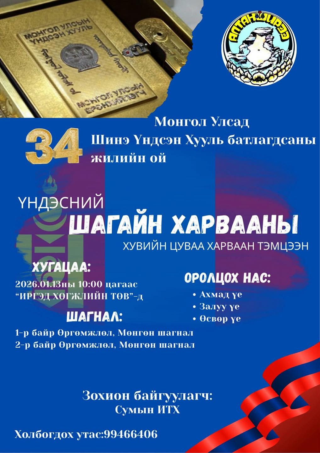 Монгол Улсад шинэ Үндсэн хууль батлагдсаны 34 жилийн ойг тохиолдуулан 2026 оны 01 дүгээр сарын 13-ны 10:00 цагаас “Иргэд хөгжлийн төвд”-д Үндэсний шагайн харвааны хувийн цуваа харваан тэмцээн зохион байгуулагдана. Холбогдох утас: 99466406